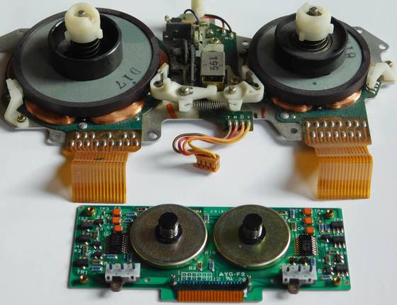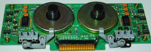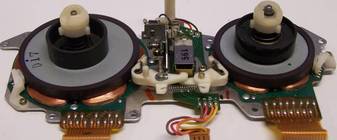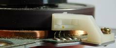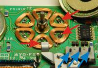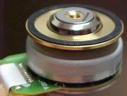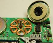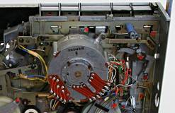 Dir Drehteller für die beiden Bandwickel sind sogar kugelgelagert. Beachten Sie auch die 3 Hall-Sensoren in dreien von den 6 Spulen (rote Pfeile). Damit läßt sich die genaue exakte Drehzahl, die Lauf-Richtung und die aktuelle Drehposition des Wickeltellers bestimmen.