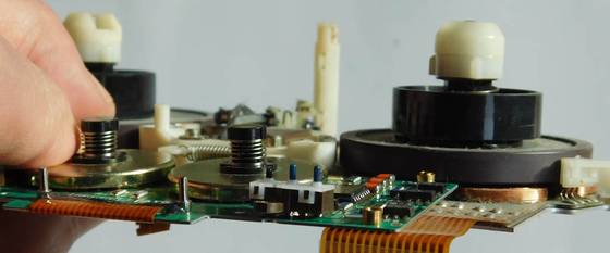 Da eines unserer uralten DDS-Laufwerke dermaßen verharzt war und lautstark geklemmt hatte, konnten wir es zerlegen. Diese Mineaturisierung ist schon beeindruckend. Die beiden unabhängigen Motörchen ermöglichen eine ganz langsame Bandgeschwindigkeit mit einem konstanten Bandzug des Bandes am Schrägspurkopf vorbei. Hier muß das Band immer stramm an der schräg drehenden Trommel anliegen - immer. Bei dem normalen analogen CC-Recorder wäre das kein Problem, doch jetzt bei den schrägen Spuren auf dem Band, da mußte alles präzise stimmen.