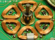 Auf die metallne Trägerplatte (aus Eisenblech) ist eine Isolierschicht (= ein Lack) samt einer Kupferschicht oben drauf - aufgebracht worden, auf dem nach dem Ätzen die Leiterbahnen übrig bleiben. Auf diese Kupferleiterbahnen werden die elektronischen Bauteile aufgelötet und die jeweils 6 dreieckigen Spulen der beiden Motörchen aufgeklebt und angelötet.